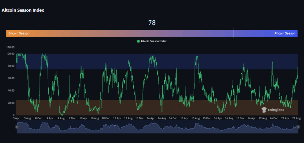 Laporan serupa ditunjukkan CoinGlass dengan skor indeks 78, sementara indikator altseason milik CoinMarketCap berada sedikit lebih rendah, yaitu 67.