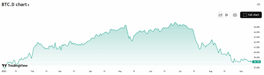 Di sisi lain, dominasi Bitcoin melemah cukup signifikan. Data BTC.D dari TradingView menunjukkan dominasi di level 58%, setara dengan posisi awal Januari 2025, ketika altcoin sempat menguasai pasar kripto.