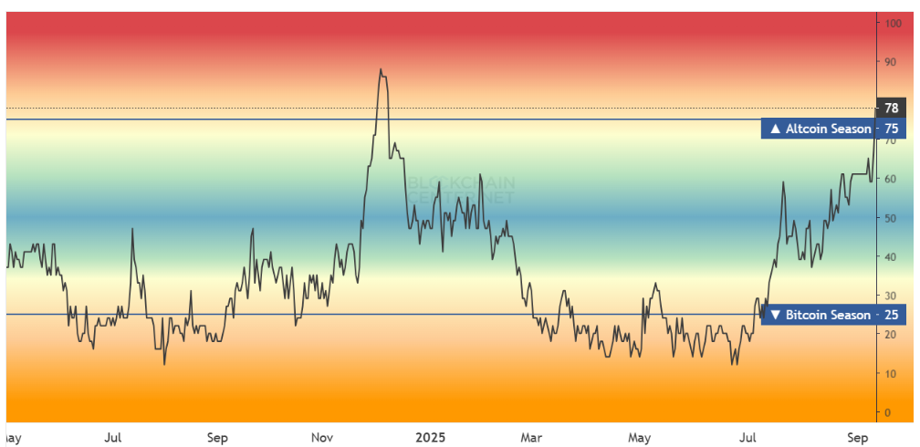 Menurut data Blockchain Center pada Kamis (11/9/2025), skor indeks altseason tercatat di angka 78 dari 100, yang merupakan level tertinggi sejak Desember 2024. Berdasarkan kriteria mereka, altseason terjadi ketika 75% dari 50 aset kripto terbesar mampu mengungguli kinerja Bitcoin dalam 90 hari terakhir.